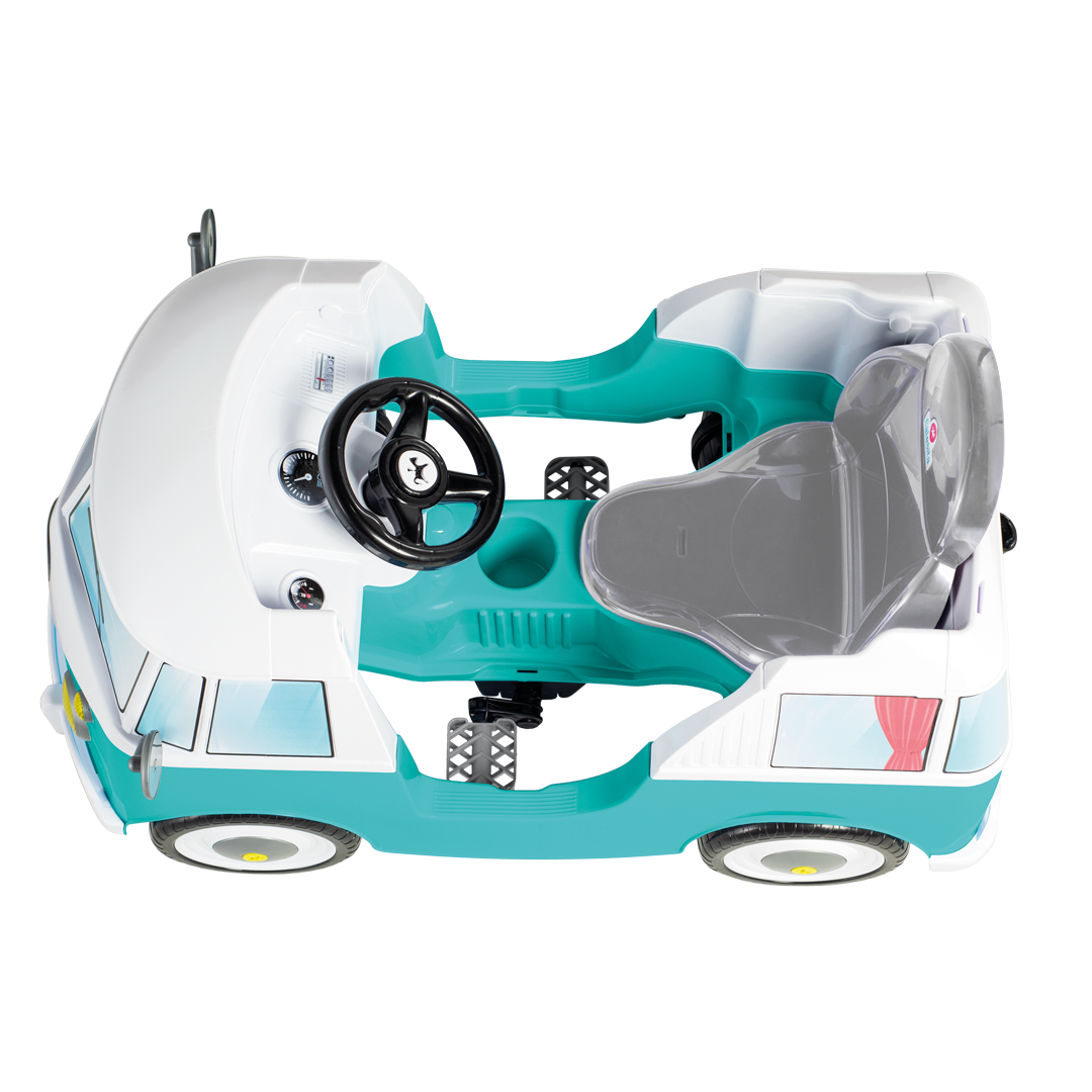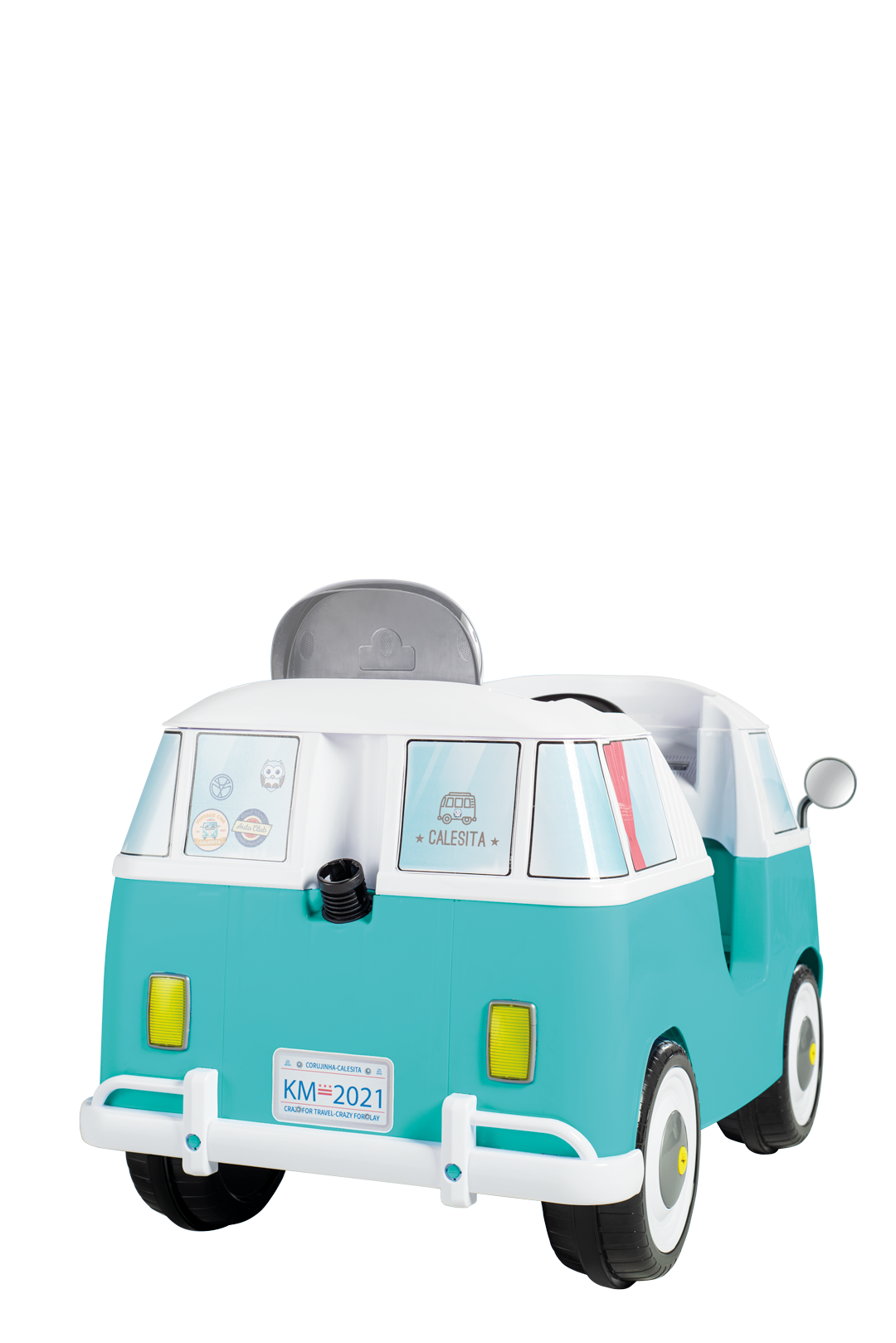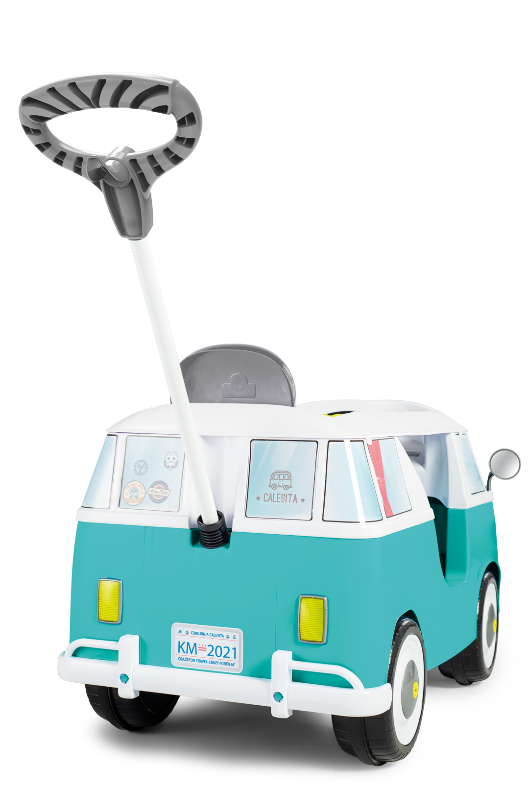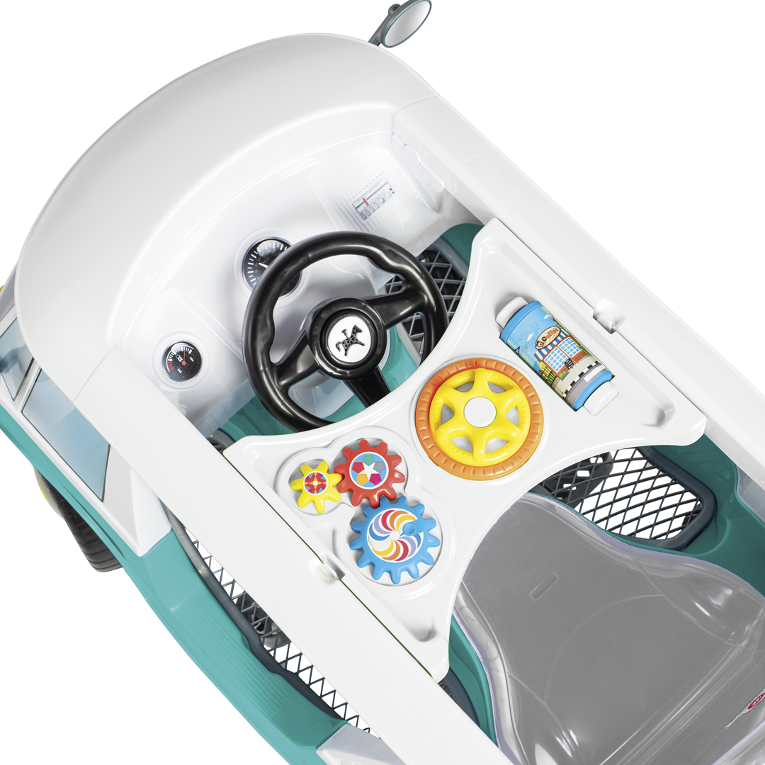 Este clásico autito viene con muchos detalles, tiene retrovisor y faroles de juguetes, bocina y cinturón de seguridad. También viene con espacio para guardar pequeños accesorios o botella de agua.